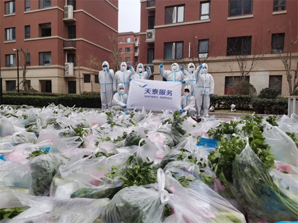 (图:社区居民志愿者与天泰服务员工携手战“疫”)