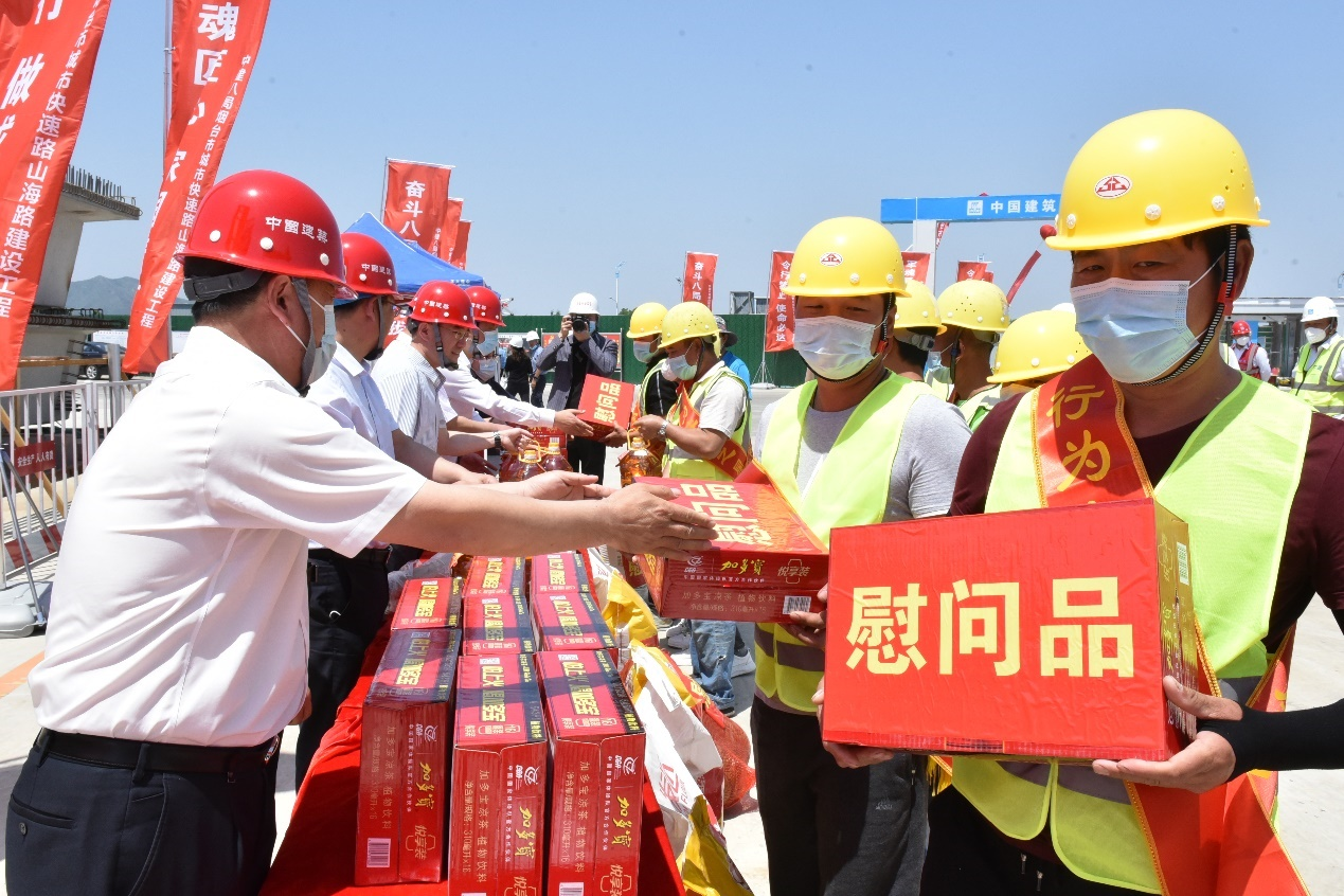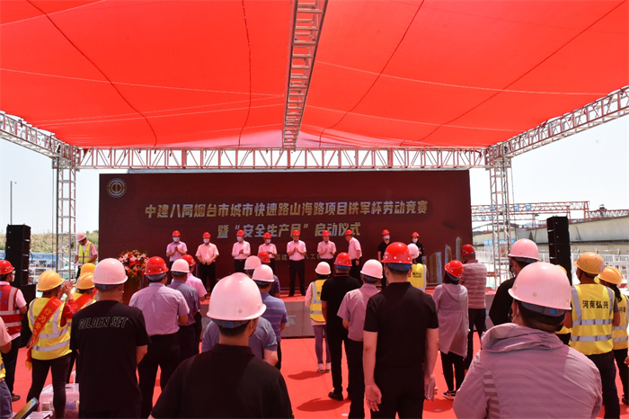 5月28日,烟台城市快速路山海路项目举行“铁军杯”劳动竞赛暨安全生产月活动启动仪式。烟台市总工会党组成员、市私营企业工会主席鲍明凌,烟台市住建局党组成员、副局长宋志方,快速路专班副主任徐增虎,烟台市轨道交通集团有限公司党委委员、副总经理张学超,共青团莱山区委副书记刘丹丹,烟台市质量安全监督站站长林世乐,烟台市总工会生产部部长史秀波,中建八局二公司工会副主席王永宽及山海路项目管理人员与工友代表等60余人参加。
