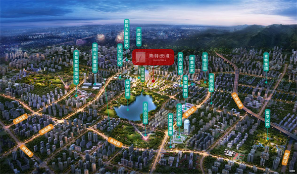 青特·云境占据白云山芯的生态贵脉之上,周边“三山两园一湖”环绕,近享主城之上难得的山湖大境;社区北面无缝嵌入市政公园,出入不再有边界感,让绿野与公园成为繁华与宁静之间最好的缓冲带;项目引西侧的虹子湖水流经社区,匠心独运,营造“玉带缠腰”的水岸居住质感。