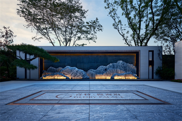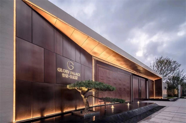 青特·悦海府花样精美的铜质大门,长约33米,高约6米,其纹路非常立体自然。这是老匠人采用腐蚀工艺在整片铜板上腐蚀留痕的工艺。腐蚀深度从3丝到8丝(微米)做了6个样本,经过反复对比,选择了效果最佳的版本。从寻找梧桐的吉祥叶脉,到工匠利用手工和科技匠心锻造,每一步过程的心血都无法衡量。