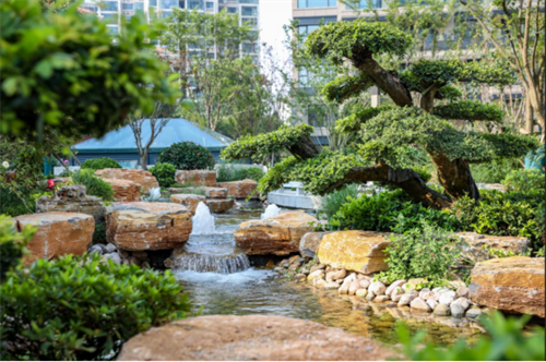 青岛市崂山区佳源华府融合东方传统园林居住观,设计泗水穿廊景观,小桥流水穿梭其中。小区树木高度、胸径、冠幅大小一致、分支、角度朝向,皆是佳源华府的精细考量。