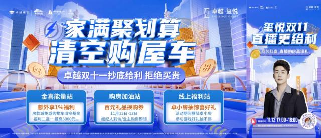卓越·玺悦双十一期间认购即享额外1%优惠,享房款减免金或购屋车清空基金;11月12日-13日,经纪人到访或业主购房即送百元礼品换购券;活动期间登陆卓小房游戏,线上抽惊喜好礼,福利享不停!幸福热线:0532-87826777。