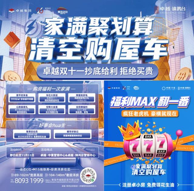 卓越·天元、卓越·屿海双盘齐发,浓情壕礼盛惠双十一。直播间专属优惠,拒绝套路拒绝想象,抄底房源全民爆抢;总裁专属特价房最高优惠12万,福利来袭,敬献岛城;参与卓小房互动游戏,瓜分万元购屋车奖金;老业主成交可享1.5倍佣金,购房福利狂撒,力度令人咋舌!预约专线:0532-55668888。