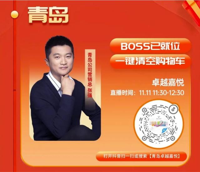 11月11日11:30-12:30,青岛卓越嘉悦抖音直播间,青岛公司营销总“价”到,以1%购物车清空基金掀起一场岛城狂欢,一小时12轮抽奖,就等你来!更有卓越·锦鸿台、卓越·中寰、卓越·玺悦三大分会场,红包、大牌家电大放送,好礼狂撒,千万好礼花落你家!