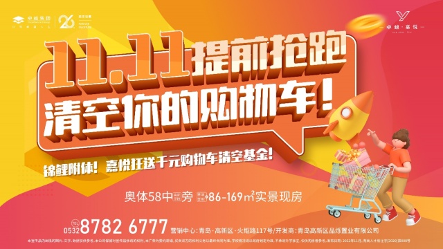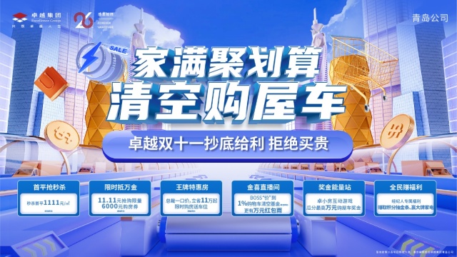 秒杀首平1111元/㎡(限定房源)、瓜分万元购屋车奖金、11.11元抢购6000元购房券(限定房源)、王牌特惠房立省11万起、BOSS亲临直播间,送购物车清空基金、万元红包雨……好房让利,拒绝买贵!卓越青岛抄底放价,惠动全城,这个双十一,卓越青岛就购了!
