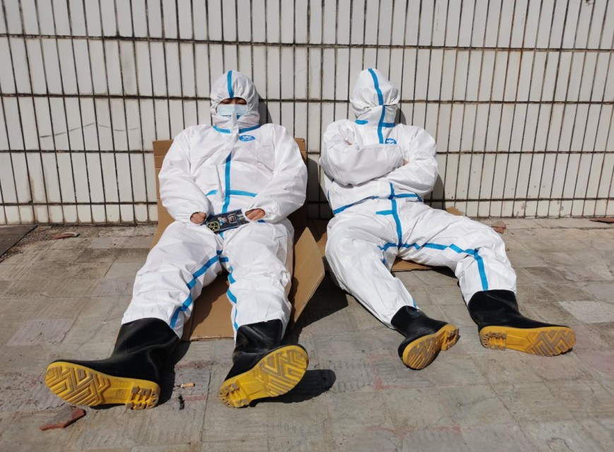 有时候会忍不住问他们,穿着一次性全罩防护服,背上30多公斤的大功率油动喷雾消杀器,完成一整天的消杀工作会是怎样的一种“酸爽”?“早上起床后就不敢喝水了,出去一天几乎都不吃饭、不喝水、不上厕所,一直等到晚上回帐篷,才会吃饭休息。一天下来,里面的衣服都是湿透的。”队员单浩憨憨地笑着说。