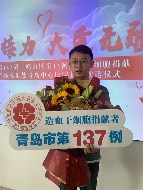2022年5月25日,青岛市红十字会、崂山区红十字会举行仪式,欢送青岛习远咨询公司的90后小伙孙福东奔赴青岛中心医院,用他的热血去挽救一名白血病患者的生命。捐献成功后,他将成为青岛市第137例、崂山区第13例非血缘关系造血干细胞捐献者。