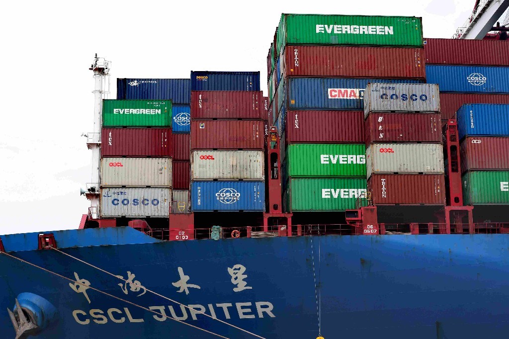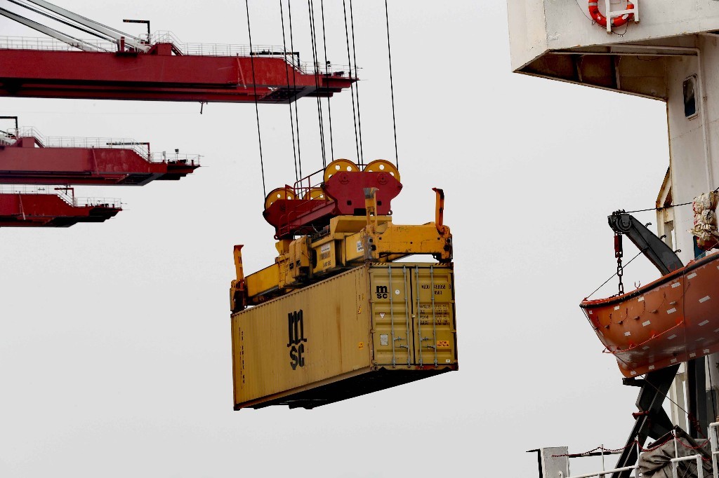 4月5日,在山东港口青岛港前湾外贸集装箱码头,数艘货轮靠泊在码头装卸货物。张进刚 摄