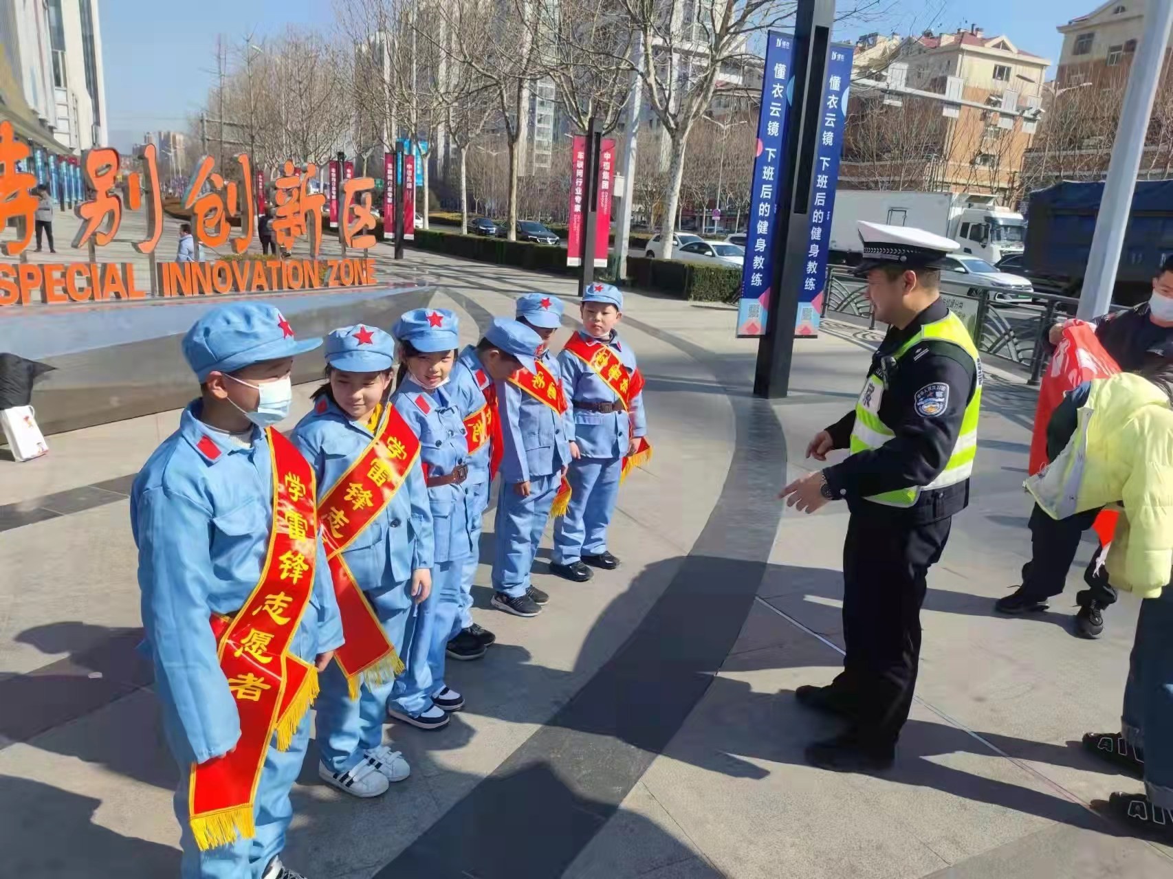 随后,小志愿者们身着老军装、臂带红袖章、身披“学雷锋志愿活动”绶带,在交警叔叔的带领下走上街头,运用刚刚学习到的交通指挥手势,有模有样的协助疏导交通、维护交通秩序,引导行人走斑马线,按照信号指示灯通行,提示过往车辆减速慢行,注意避让行人,并对电动自行车通过人行横道时不下车推行、车主未佩戴安全头盔、逆向行驶等交通违法行为进行劝导。小志愿者们通过身体力行的方式,积极倡导交通参与者们自觉摒弃不文明交通行为和交通陋习,引导群众遵守交通法律法规,做到平安文明出行,从而更加深刻地了解到助人为乐、甘于奉献的雷锋精神,