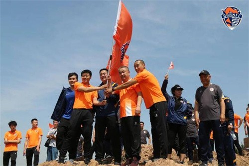 随后,与会嘉宾、海牛俱乐部职业队全体人员、已经完成训练任务的U15梯队,球迷代表共同攀登了位于基地后侧的老虎山,队伍沿山路展开,形成了众志成城的“橙色长城”,恰逢青岛解放73周年之际,攀登纪念青岛解放主题的老虎山公园,也让俱乐部全体人员更加坚定了为青岛而战的信念。最终,仅耗时25分钟,全体人员成功登顶,山顶上,田卫国主任与乔伟光董事长共同向海牛队长沙一博授旗。“虎年登虎山、虎虎生威,希望海牛队像今天攀登虎山一样在本赛季登顶成功!”田主任说道。