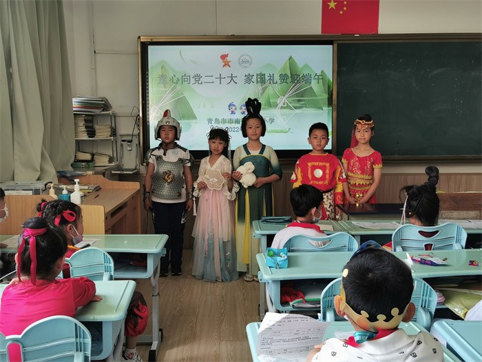弘扬屈原文化,传承求索精神。各中队队会上,在中队辅导员的带领下,队员们一起了解了端午节的美食雄黄酒、粽子的包法等,及有关端午节诗词、谚语文化作品。队员们身着汉服,诵读屈原诗词。
