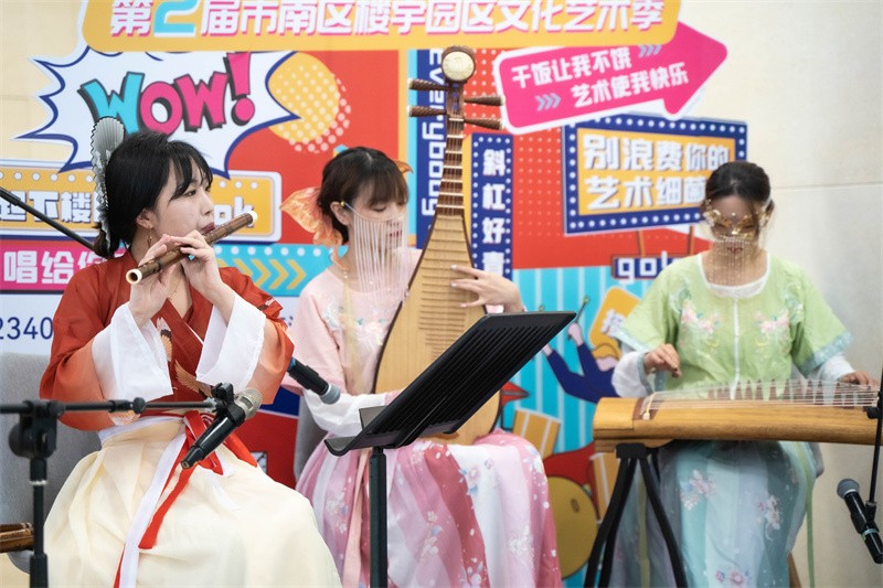 而“青文驿”在最初进楼宇的时候并不容易。“很多楼宇物业对于这种新生的公共文化服务方式不理解,不知道我们是干什么的,很多楼宇的企业也是抱以怀疑的态度,以为我们是广告传销。”市南区文化馆馆长董婷回想第一次“青文驿”进楼宇的场景,“初进楼宇园区,为了尽快破冰,文化馆工作人员楼宇里面挨家走访企业,扫楼摸底,问卷调研,征集需求,整合资源,定制化服务。”考虑到在商务楼宇人群多为青年人,“青文驿”在舞台背景板设计上也很花心思,“起立吧,青年”、“有为之年,不躺平”、“干饭让我不饿,艺术使我快乐”,一句句押韵、鼓劲的时尚口号、标语、被贴进了背景板,而在演出的类型、形式上也是努力贴近年轻人。《沧海一声笑》等一首首武侠风民乐曲,在锦鲤国潮乐坊深情演绎下,给忙碌了一上午的楼宇白领带来轻松愉悦,耳熟能详的旋律以及演员汉服服饰都有极强的代入感,瞬间拉近民乐与年轻人的距离。 “没想到能在这里看到国风民乐演出,平时就很喜欢看武侠小说,中午下楼偶遇这么一场音乐会,第一次这么近距离观看演员演出,太惊喜了”黄金广场上班族李先生开心地说。首场演出成功举办,让“青文驿”这个品牌迅速得到了楼宇企业和物业的认可,对这种文化服务方式的接受度、参与度都很高。“现在很多楼宇物业都主动询问演出时间,有的还想和我们一起联合举办活动,青文驿楼宇站点的数量也从去年的4座,增加到现在的10座。”董婷说道。