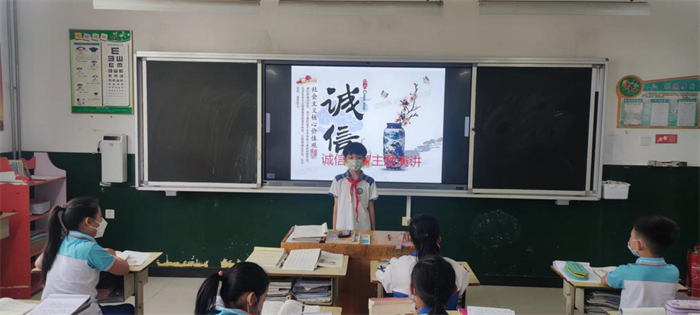 各校各班、各中队还在晨间故事会中通过宣讲诚信故事、诚信格言汇展等活动,让队员们明白丢失诚信的危害,领悟诚信的重要。做诚信好学生日常评议活动。学校各中队纪律委员专门负责纪律自律、作业独立完成、做人表里如一,做事言行一致方面的督促、登记与每周总结。每周评选“诚信之星”,并上报中队辅导员,在班级公示牌内表扬,喜报家长。