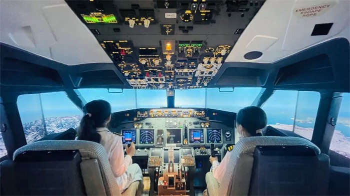 波音737-800型号驾驶舱模型按照1:1比例还原,采用270度球幕成像,借助三通道融合技术,使学生们的体验感受与真实飞行无限接近。