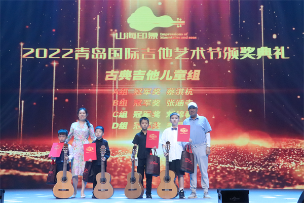 在颁奖现场,由青岛市艺术研究院副院长、青岛市音协副主席、国家艺术基金评委叶蓉,青岛市原创音乐协会主席郭传林为古典吉他儿童A组冠军蔡淇杭、B组冠军张涵寺、C组冠军刘锦羲、D组冠军李昊轩颁奖。
