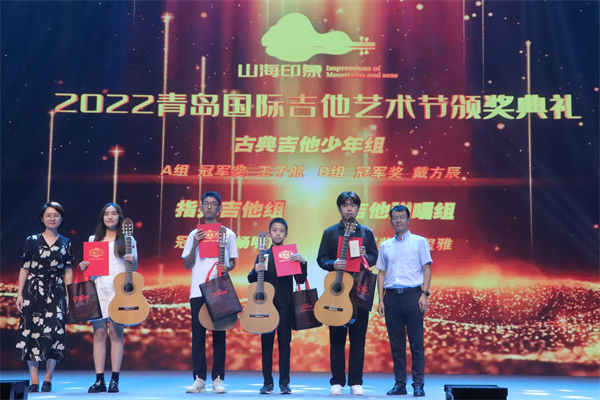 中共青岛市委宣传部文化产业处处长闫杰,青岛市文化和旅游局艺术处处长李珺竹为古典吉他少年A组冠军王子航、B组冠军戴方辰、指弹吉他组冠军杨明言、吉他弹唱组冠军王玺雅颁奖。