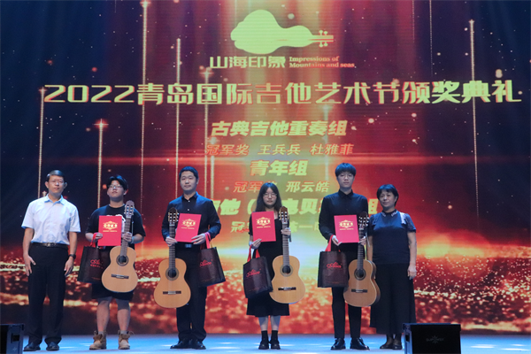 中共崂山区委常委、宣传部部长彭鹿鸣,崂山区政协副主席李恒光为古典吉他重奏组冠军王兵兵、杜雅菲,青年组冠军邢云皓,电吉他(含贝斯)组冠军陈一鸣颁奖。