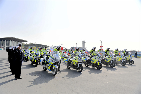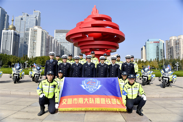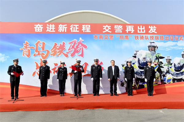 10月28日上午,以“奋进新征程,交警再出发”为主题,青岛市南交警在奥帆基地举行了“翔鹰”铁骑队授旗暨出征仪式。