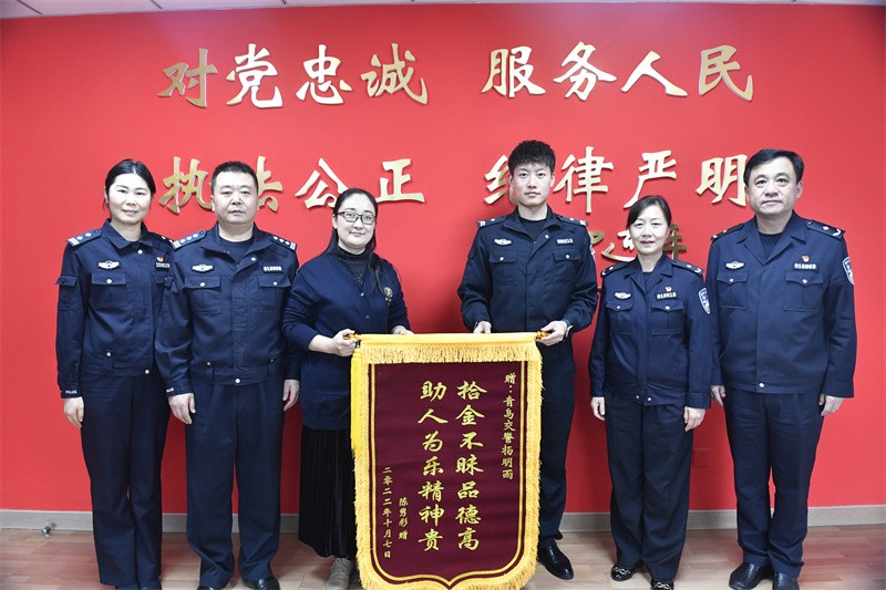 国庆期间,市南分所辅警杨明雨捡到一个黑色手包,第一时间交给失主。失主现场对交警的热心帮助、拾金不昧表示感谢,同时为我们的工作点赞。10月19日,失主专程送来锦旗,再次表示感谢!更鞭策我们在以后的工作中切实把群众的事办实办好,真心实意为民解忧。