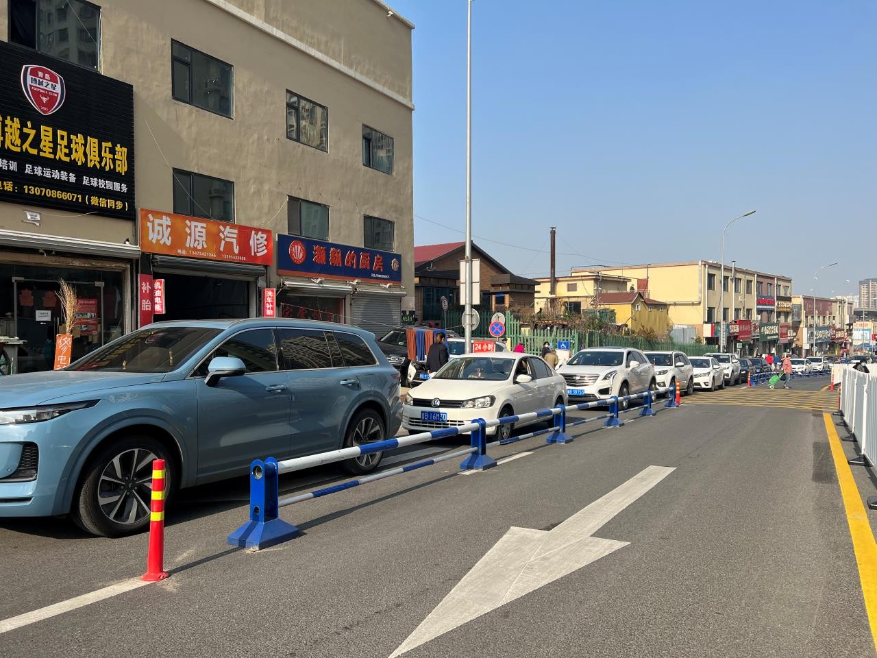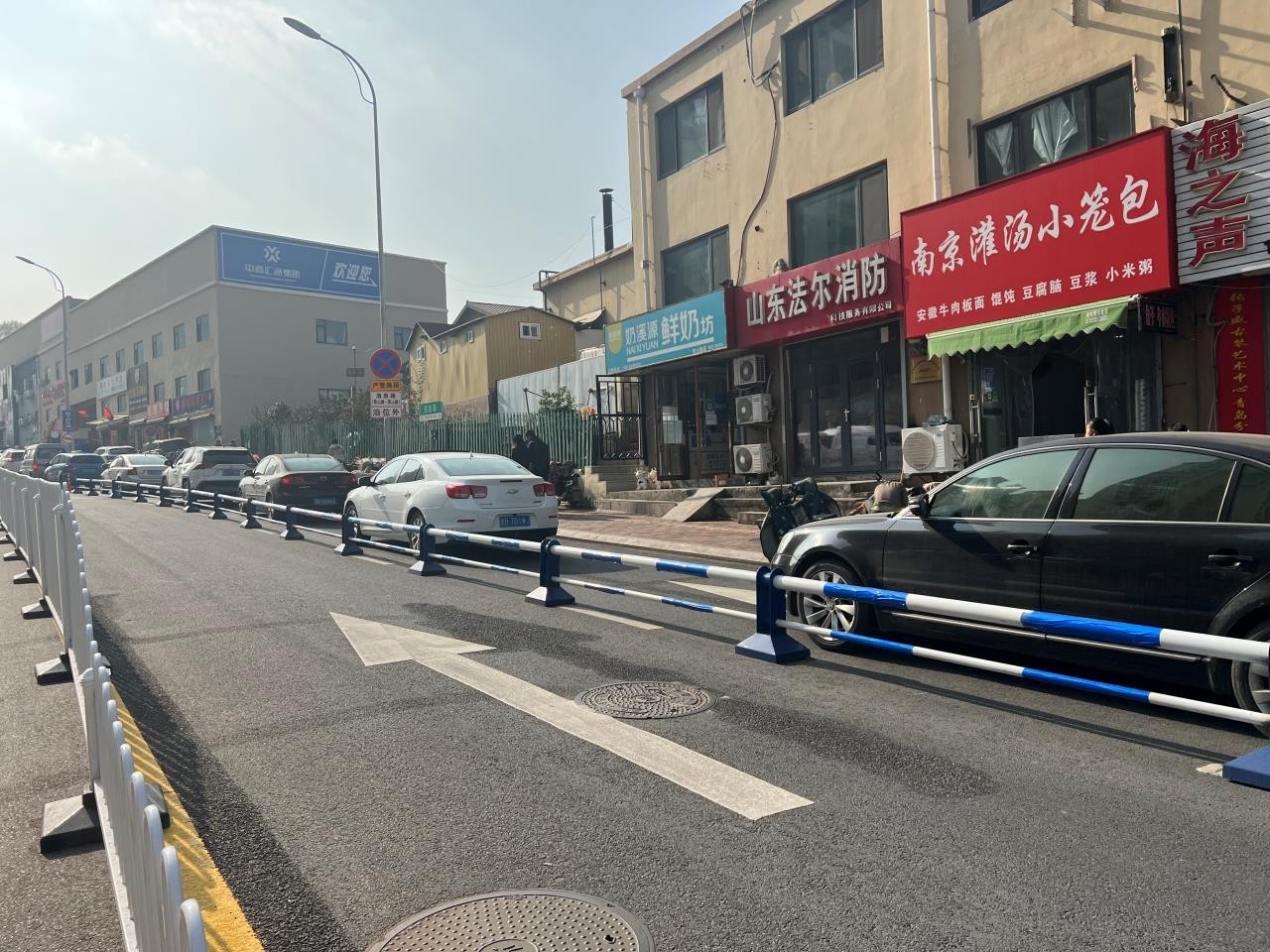 今天的李村大集与以往相比,交通秩序有了明显改观。为防止行人乱穿马路,李沧交警在李村大集门前清泉路中间设置了一米高的护栏,将原有的低矮的护栏移到了停车场入口处,隔出一条大约五十米长的专用通道,供进停车场的车辆排队使用。