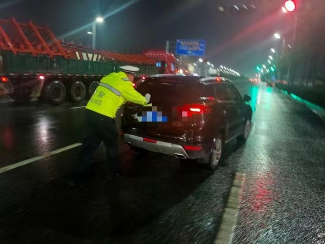 驾驶员对交警连声道谢,称幸好遇到交警帮他一起将车挪到路边。