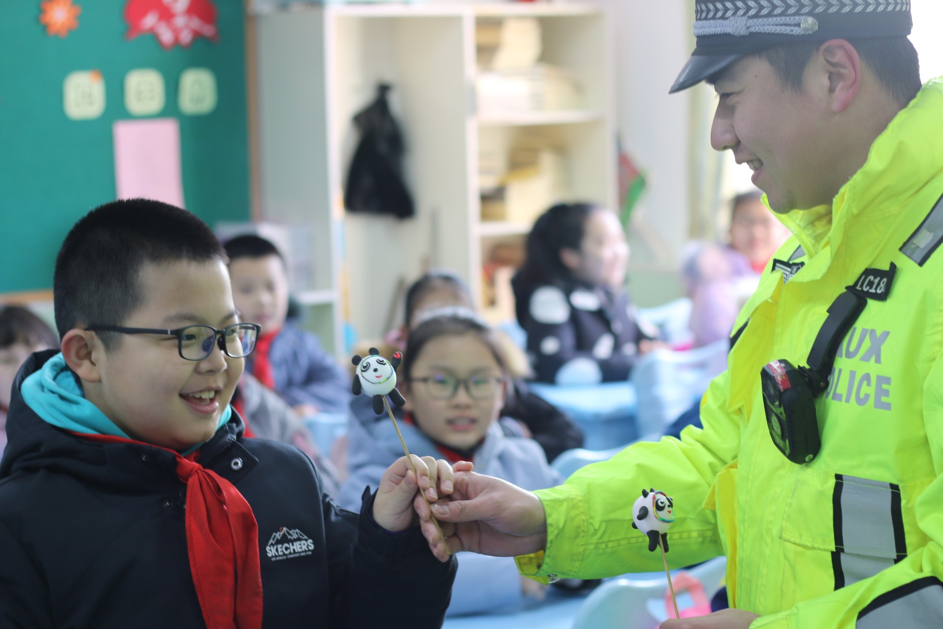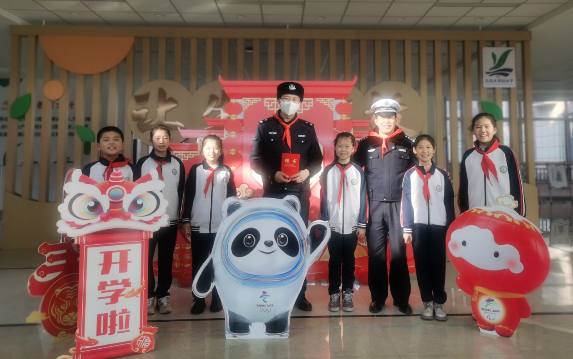 交通安全进校园是青岛交警李沧大队常年坚持的安全宣讲工作的重中之重,开学第一课更是每个开学季的“必修课”。在广水路小学,天水路中队民警王卓堂已经是连续第六年陪伴孩子们的开学返校第一天,交通安全在这位交警叔叔这里,每一次的温馨提示和精彩互动,都让孩子们感到有趣不已又受益匪浅,可谓是年复一年但又常说常新。在沧海路小学,来自火车北站中队的辅警管军为孩子们在路口进行了交通事故现场的简单模拟和讲解,更在接下来的授课环节为孩子们送上由沧口街道紫荆苑社区的姐姐阿姨们亲手制作的“冰墩墩”黏土玩偶作为奖励。" 叔叔请放心,我们一定遵守交通法规。"拿到春节档最火玩偶的同学们纷纷表示。
