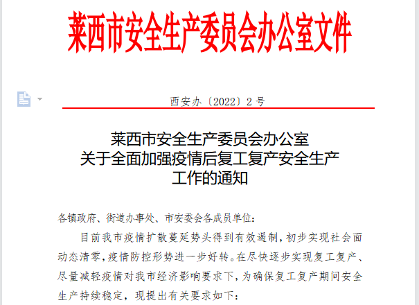 莱西市应急局统筹考虑疫情影响和企业集中复工复产因素,充分分析研判当前企业复工普遍存在的员工返厂数量不足、心理不稳定、安全管理和教育培训受限等因素,提前谋划制定了《关于全面加强疫情后复工复产安全生产工作的通知》,对企业复工复产安全生产管理提出了具体要求、明确了具体措施,并第一时间下发传达学习,确保企业复工复产安全措施全面、过程规范有序、开车平稳可控。