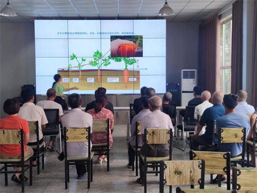 青岛农业大学农技专家团队立足店埠镇农业产业实际,开展室内课堂靶向培训,开设《胡萝卜生育期需肥规律》的综合性课程讲解,组织参训人员集体观看科技培训和实用技术专题片,开展现场答疑。