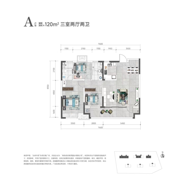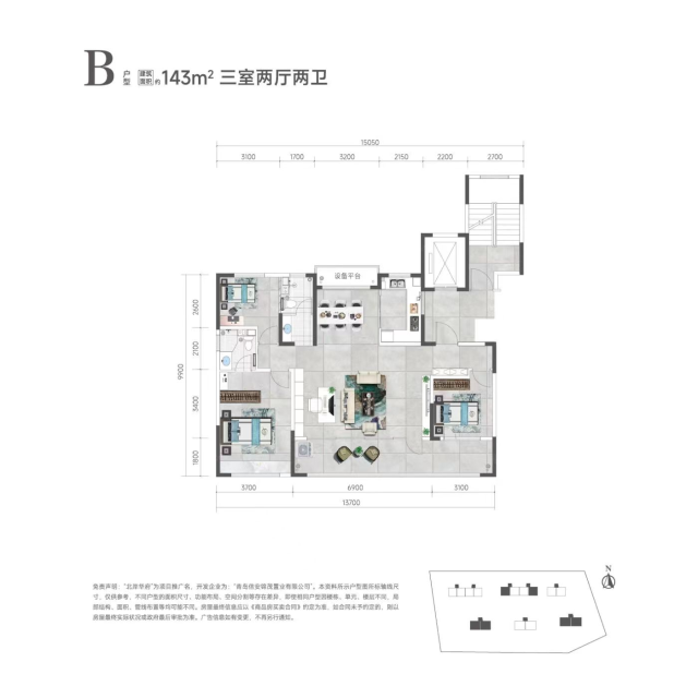 建筑面积约143㎡的三室两厅两卫,约13.7m南向整体开间和约10m长面宽,一步到位,提升居住的舒适度和尺度感。