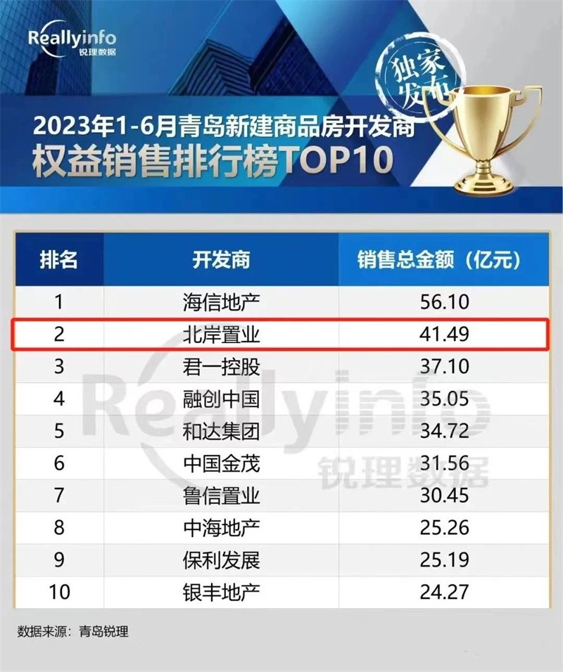 在2023年上半年青岛新建商品房开发商权益销售排行榜TOP10中,北岸置业以绝对优势排名第二,彰显了强劲实力。秉承社会责任和担当的初心,北岸置业近期正在举办2023北岸杯青少年足球赛,深入传递足球文化,丰富市民休闲生活。