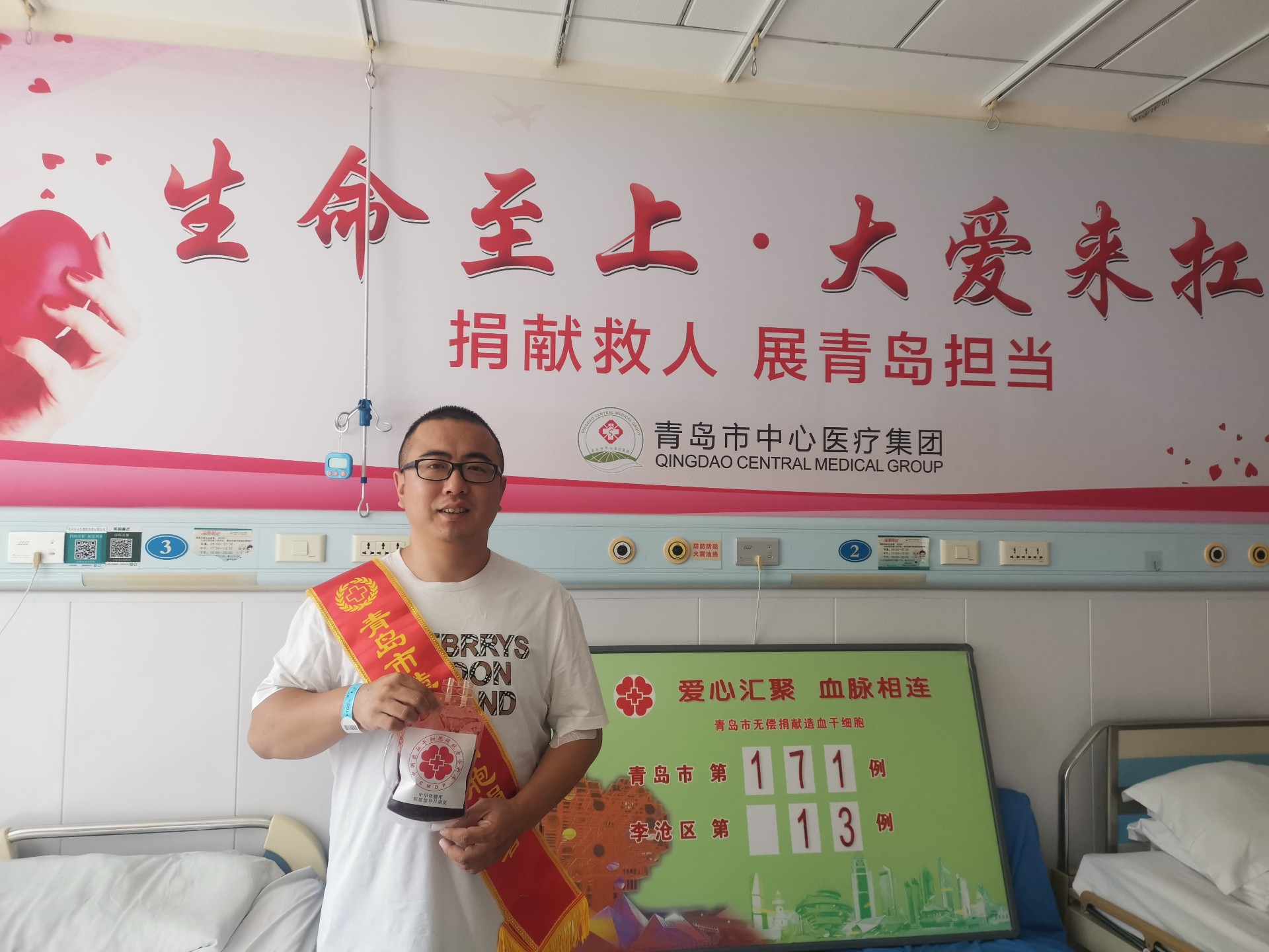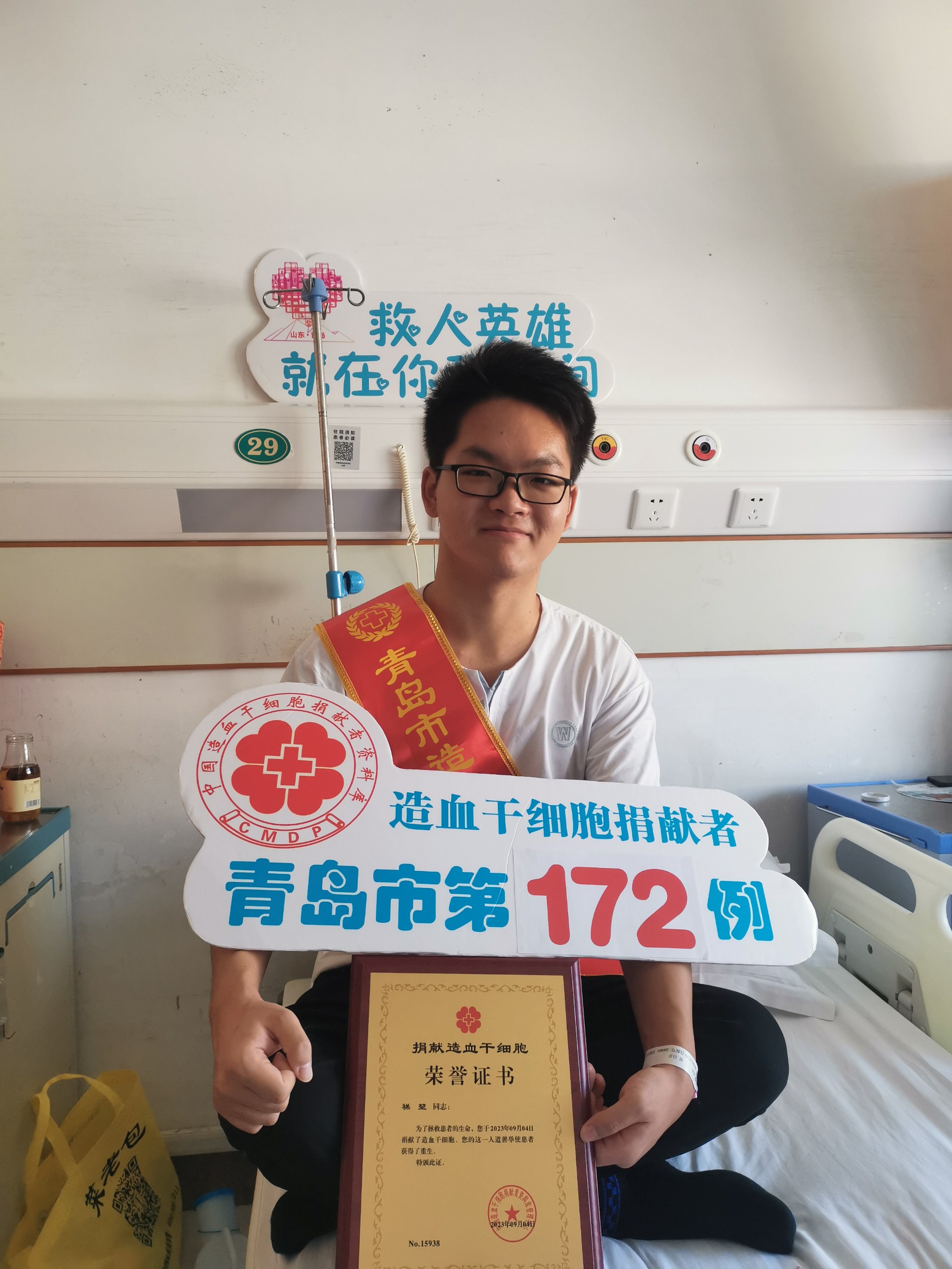 2023年9月4日,来自中国海洋大学的大学生禚堃在青岛大学附属医院成功完成造血干细胞捐献,成为青岛市第172例造血干细胞捐献者。三个周内,青岛市完成了四例造血干细胞捐献,这意味着捐献者素不相识的四位血液病患者收到了来自青岛的“生命礼物”,获得了生命重生的希望。