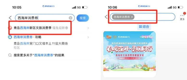 打开携程旅行APP,在首页搜索栏输入“西海岸消费券”,进入活动页面。