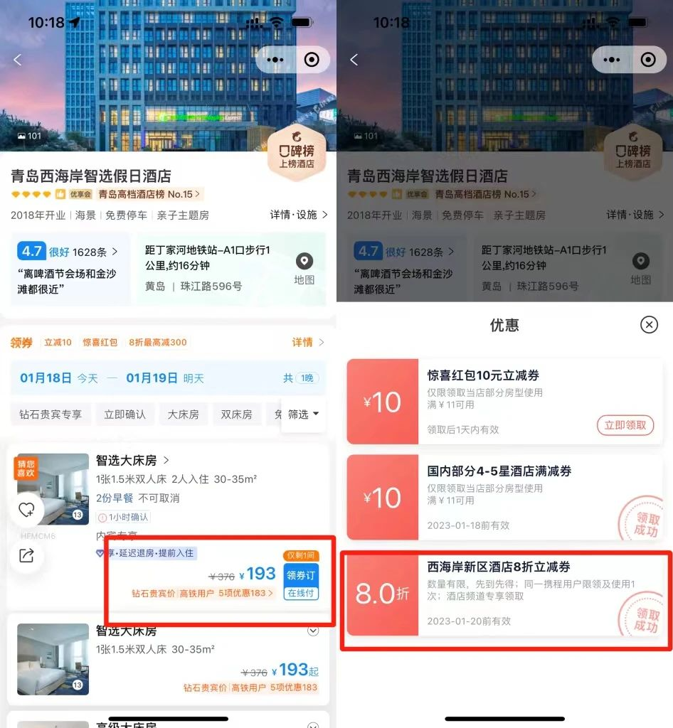 打开携程旅行APP,进入“酒店”频道,定位青岛西海岸新区目的地,点击查询后观看产品列表,选择带有折扣券标签的酒店后进入其详情页,点击“领券订”即可一键完成下单,享受本次优惠。