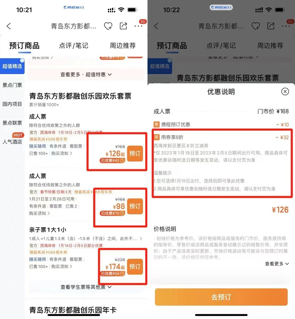 打开携程旅行APP,进入“门票活动”频道,定位青岛西海岸新区目的地,进入景点详情页面,选择在具体产品信息处显示目的地优惠券标签的产品项,点击“预订”并选择日期后,可在订单填写页面查看优惠明细,点击“去预订”即可享受补贴优惠。