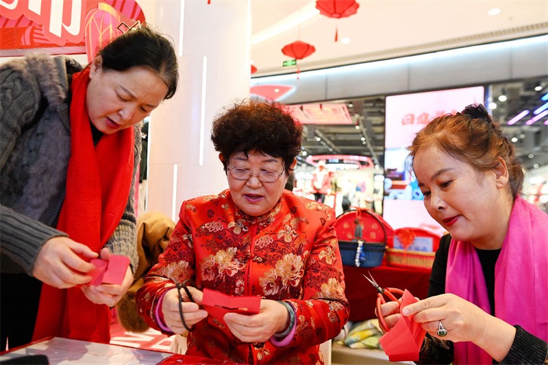 剪纸展示摊位前,身着红色唐装的程丕昉正在剪纸。只见她手执一把小巧的剪刀,红色的卡纸在手中翻转,不一会儿,一只惟妙惟肖的小兔子便呈现眼前。“这是‘胶州剪纸’,既融有纤巧工秀、装饰浓郁、近于写实的南国情韵,又保留粗壮质朴、简练明快、崇尚概括的北方基调特点。”程丕昉介绍说。