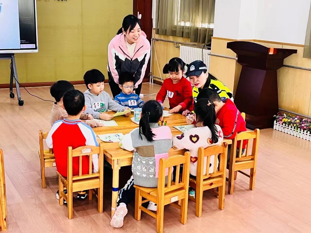 通过交警叔叔阿姨的亲临,孩子们第一次感受到警察职业的庄严与重要,为了表达对他们的感谢,孩子们将亲手制作的花束送给今天到来的伟大的人民警察,小小的警察梦在孩子心中生根发芽。