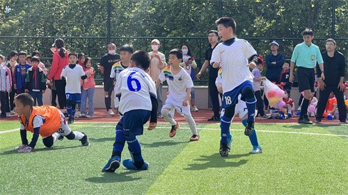 伴随着开场裁判员哨声的响起,足球对抗赛来了。中国足球协会国家级裁判、现役中超联赛助理裁判员张美林以及中国足球协会预备国家级裁判焦明胜担任此次比赛裁判。校长张晓迎与各位与会嘉宾共同为青岛镇江路小学开出了2023年足球节第一球。球员熟练的脚下动作,娴熟的肢体配合无不体现他们运动健儿的风范。场上的队员们进行着激烈的比拼,场下的学生们也激情澎湃,为场上的同学加油,呐喊,助威,空旷的足球场瞬间变成了孩子们的乐园。