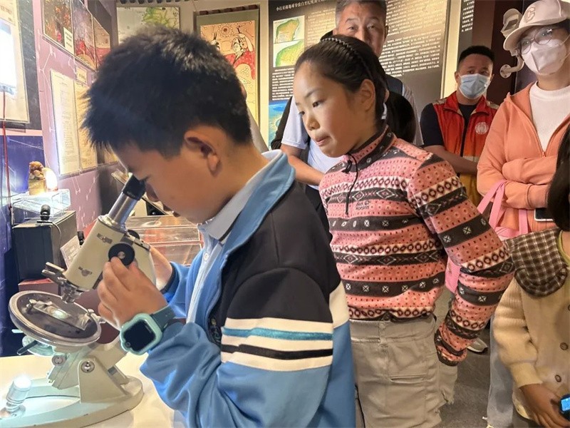 博物馆的几十枚陨石让孩子们兴奋不已,工作人员还提供了亲手触摸陨石的机会,让孩子们零距离接触“星星的眼泪”。此外,博物馆还提供四台不同的显微镜供孩子们观察球粒陨石切片,在微观世界中探究天外来石的奥秘。