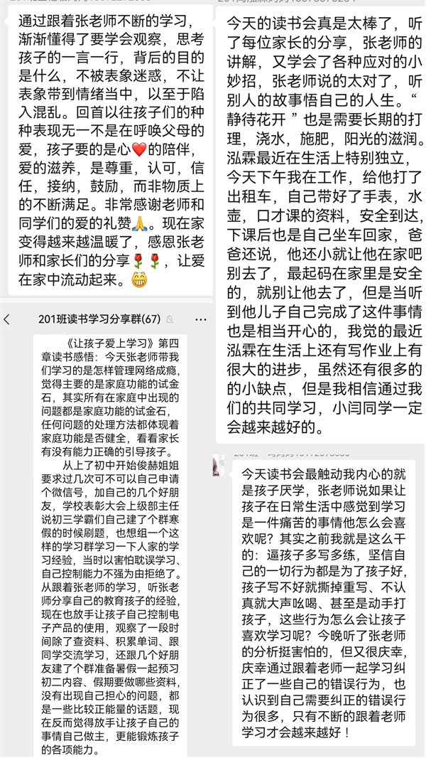 201班全体家长感谢班主任张燕给大家带来学习成长和分享的机会,缓解了在教育孩子方面的一些家庭矛盾,家长表示,尤其孩子们的变化很大。