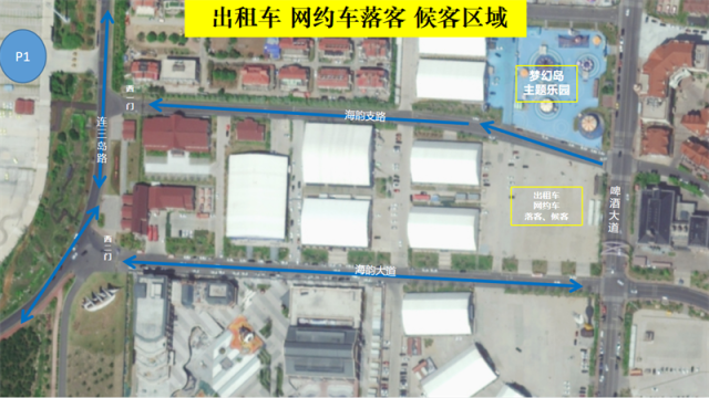 2、出租车、网约车至啤酒城梦幻岛主题乐园南侧广场落客、候客。