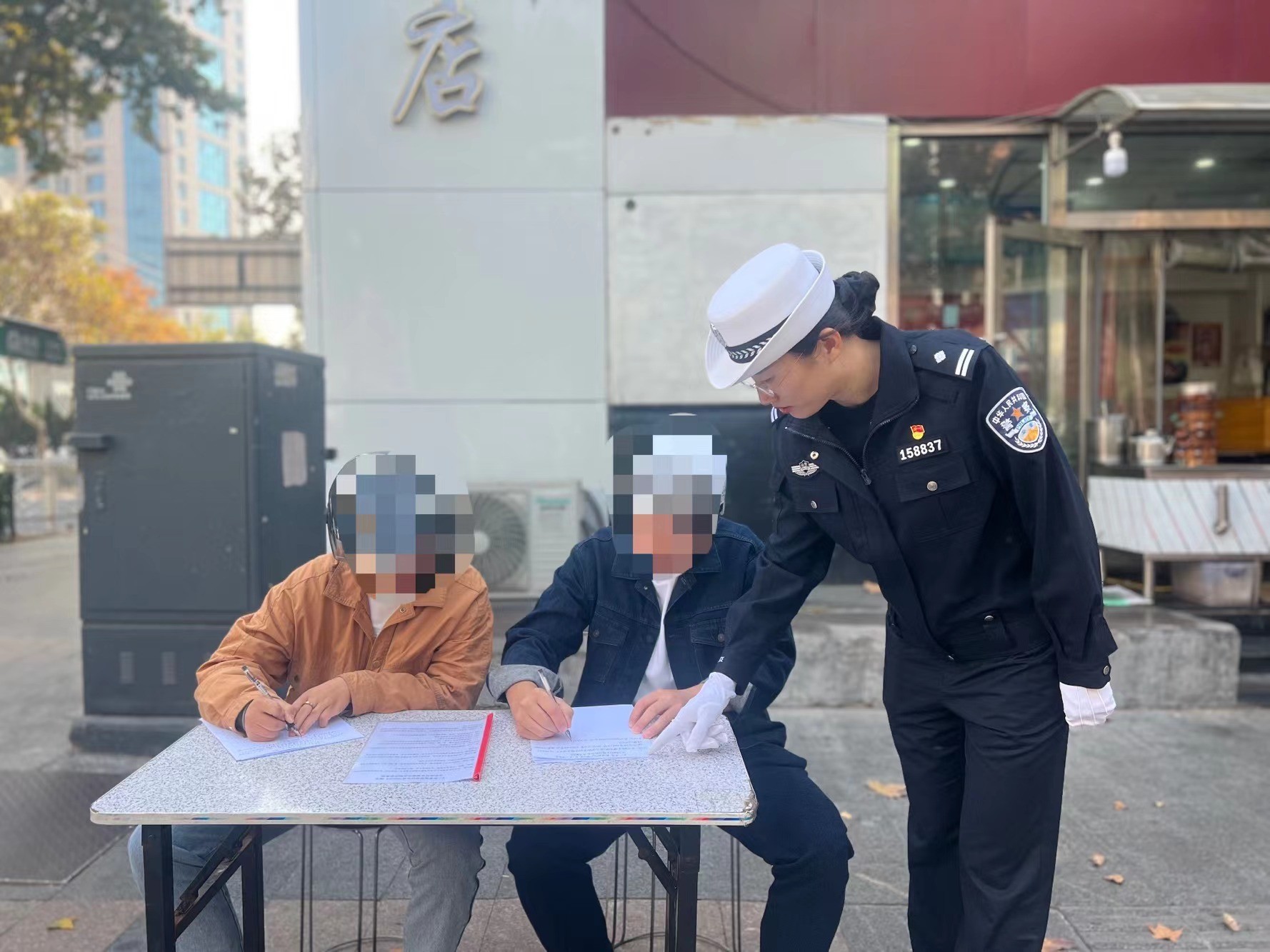 两位年轻人在交警的引导下,认认真真抄写法条,“以前不知道,这下真是学习了!”