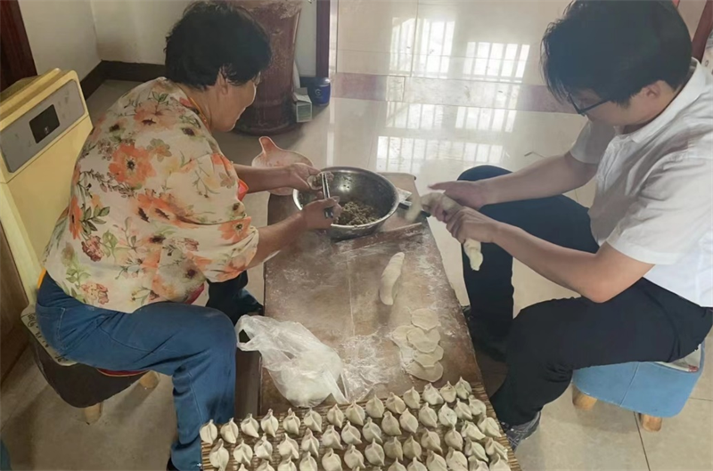 在农户家中,学员们迅速转变身份、转换角色,把村民当亲人,把自己当成这户人家的“小儿子”“小女儿”,帮忙摘菜洗菜、下厨烹制,大家同吃“一锅饭”;清扫庭院卫生、帮忙干干农活,共结“一家亲”;经典红歌合唱、齐跳秧歌舞,共享“欢乐日”。