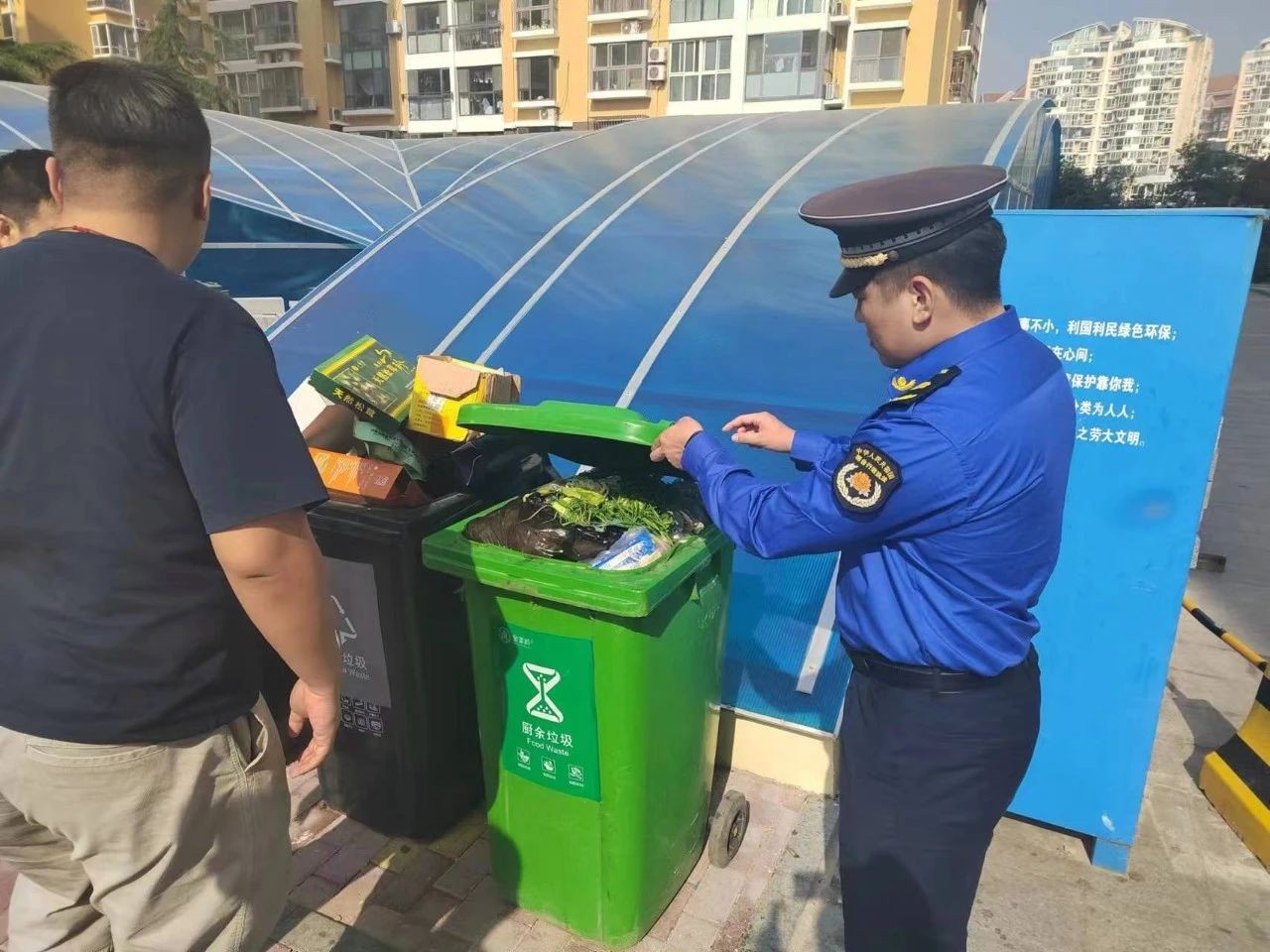 中队对辖区各小区、餐饮单位等场所的垃圾分类情况进行了执法检查。现场,执法人员坚持边执法、边普法,检查了垃圾分类收集容器、分类指示栏(牌)的设置情况,确保硬件保障到位。同时,对垃圾分类相关知识和要求进行了讲解和示范,督促相关单位依法配置设施,建立自查台账,确保执法成效不断凸显,居民分类意识不断提高。