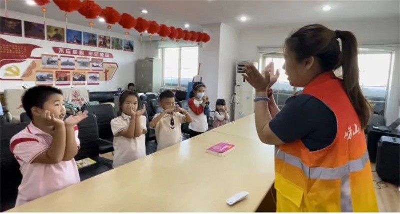 伴随着音乐声,志愿者教孩子们现场学习了《中华孝道》儿童手势舞,引导大家尊老、爱老,传递敬老传统美德。