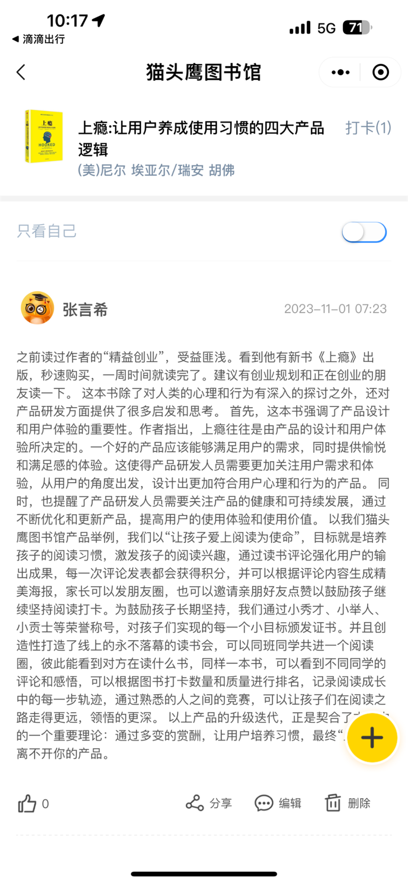 以我们猫头鹰图书馆产品举例,我们以“让孩子爱上阅读”为使命,目标就是培养孩子的阅读习惯,激发孩子的阅读兴趣,通过读书评论强化用户的输出成果,每一次评论发表都会获得积分,并可以根据评论内容生成精美海报,家长可以发朋友圈,也可以邀请亲朋好友点赞以鼓励孩子继续坚持阅读打卡。为鼓励孩子长期坚持,我们通过小秀才、小举人、小贡士等荣誉称号,对孩子们实现的每一个小目标颁发证书。并且创造性打造了线上的永不落幕的读书会,可以同班同学共进一个阅读圈,彼此能看到对方在读什么书,同样一本书,可以看到不同同学的评论和感悟,可以根据图书打卡数量和质量进行排名,记录阅读成长中的每一步轨迹,通过熟悉的人之间的竞赛,可以让孩子们在阅读之路走得更远,领悟得更深。