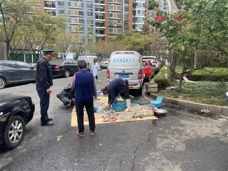 近期,青岛市崂山区麦岛综合行政执法中队执法队员巡查至某小区大门附近,发现一对夫妻占了人行道一半的宽度,售卖当季海鲜。“你好,这里不能摆摊。这是第一次发现,首违不罚,请尽快把物品拿回到车上离开。”执法队员对占路经营者进行劝离。