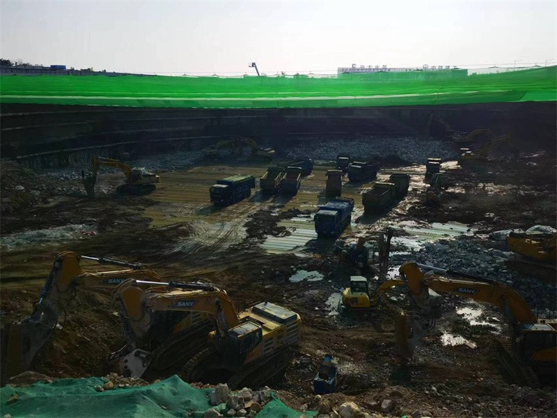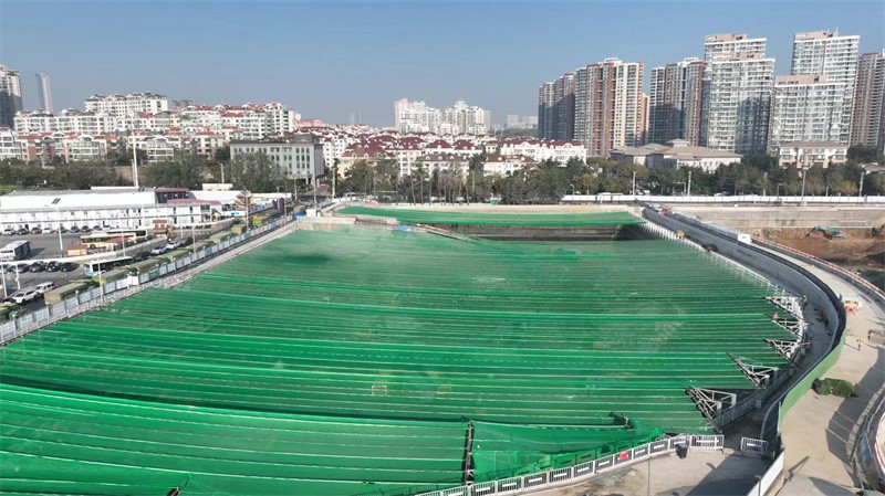 据青岛三星工程有限公司项目经理纪新光介绍,通过“天幕”系统将“露天作业”变为“室内作业”,实现了整个基坑施工场地“绿色封闭式”管理。“天幕”网是根据现状单元宽度拼接而成的,宽度2m,单元长幅8m-20m,共设置16个防尘网单元,实现基坑全覆盖,覆盖基坑总面积为20221㎡。通过自动开合式“天幕”的安装可以减少噪音、扬尘等对周边环境的影响,并且可以在内部实现全天候施工,从而提高施工效率、加快施工进度。