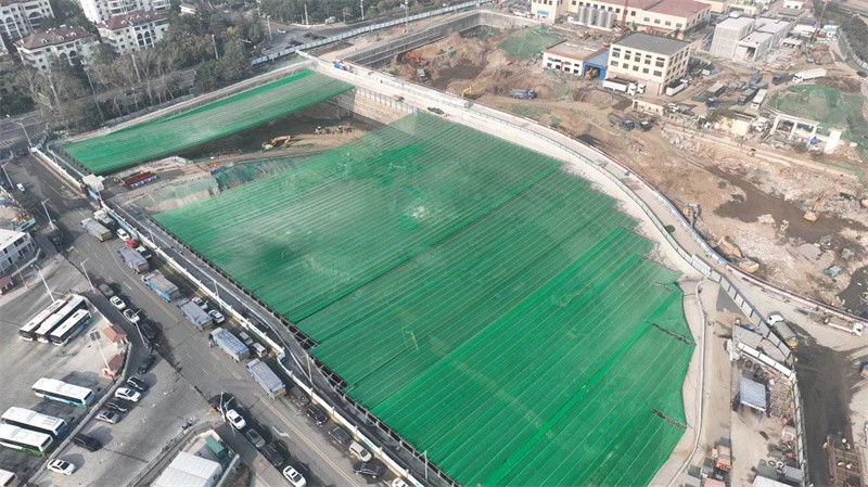 该项目地处繁华闹市区,周围小区及游客密集、交通流量大,项目基坑开挖深度约20m,开挖土石方量大,对施工期间扬尘、噪音防控提出了高要求。为贯彻落实高质量发展、探索绿色建造的切实举措,从源头上遏制扬尘,有效降低细颗粒物浓度,项目在基坑土方开挖和地下结构施工阶段上线了一项“神器”——防尘天幕,为施工现场撑起了一把巨大的“绿色遮阳伞”。