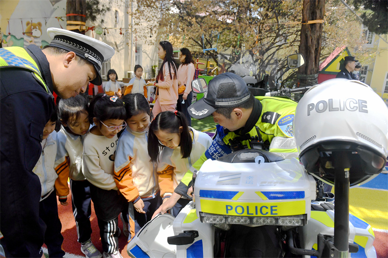 快乐美好的校园生活,离不开安全防范,孩子们的出行安全,是全社会高度关注的大事。为进一步加强儿童交通安全宣传教育,不断提高儿童“知危险 会避险”的交通安全意识和自我防护能力,预防和减少道路交通事故的发生。在《道路交通安全法》实施20周年纪念日来临之际,4月26日,交警市南大队联合特警、派出所走进文登路幼儿园,围绕“法润平安 文明相伴”主题,开展“警营开放日”活动。