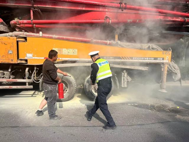 5月10日下午15点30分,青岛交警李沧大队李沙中队民警王燕和辅警刘泉、刘学尧在黑龙江中路广水路南向北方向执勤,一辆重型工程车突然停在路边,伴随着股股浓烟。经验丰富的民警王燕边跑边喊驾驶员取下灭火器,辅警刘泉、刘学尧也赶紧向过往司机借用车载灭火器,弯腰低头探入车底,将灭火器对准火源根部猛喷快速将火扑灭。原来是刹车后轮抱死造成车辆起火,幸亏交警及时发现果断出手,避免车辆起火造成更大损失。